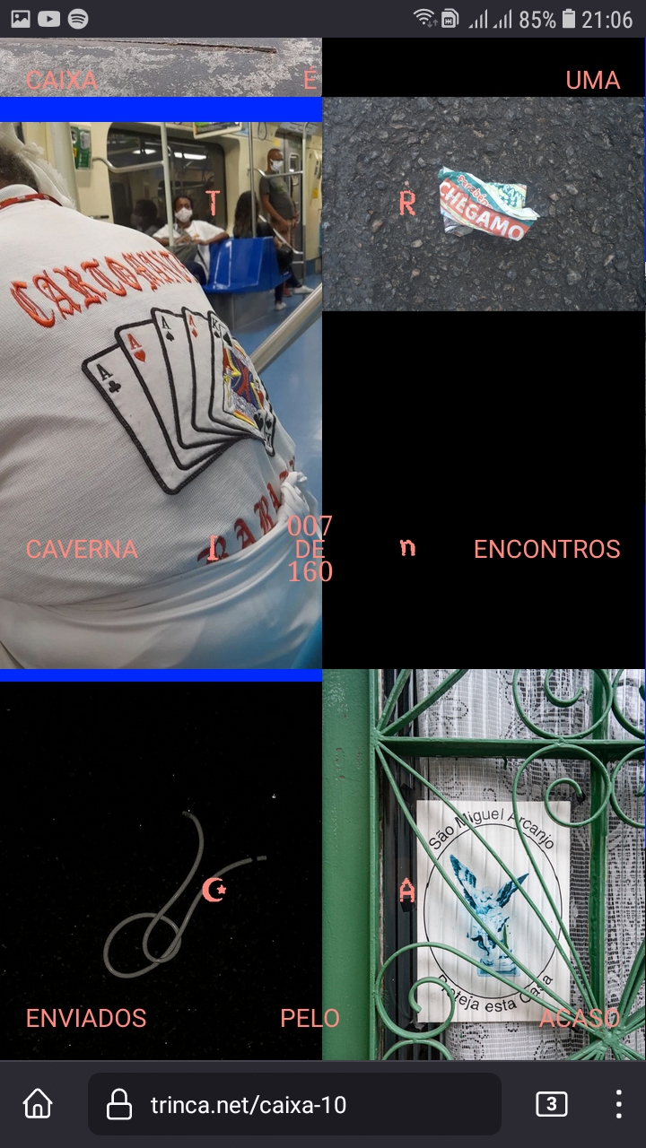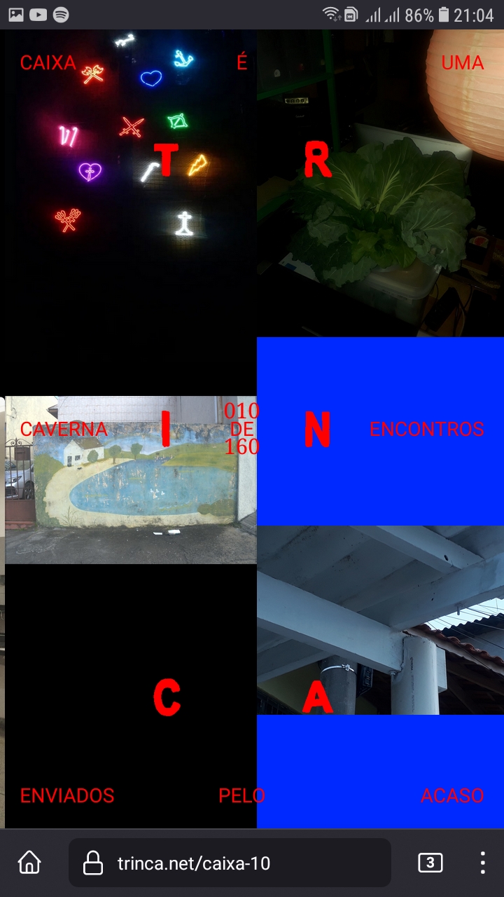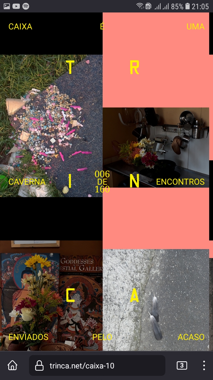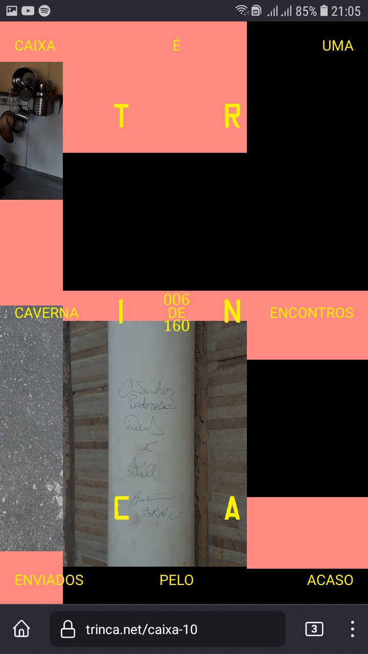 primeiro trabalho nosso como trinca, um código gera um site em 3 camadas: fundo/ mídias/ texto. as imagens carregam pretas e se revelam quando o cursor do navegador passa em cima, como num jogo oracular. a cada visita o código gera uma nova ordem, tamanho e posicionamento das mídias e combinação de cores.