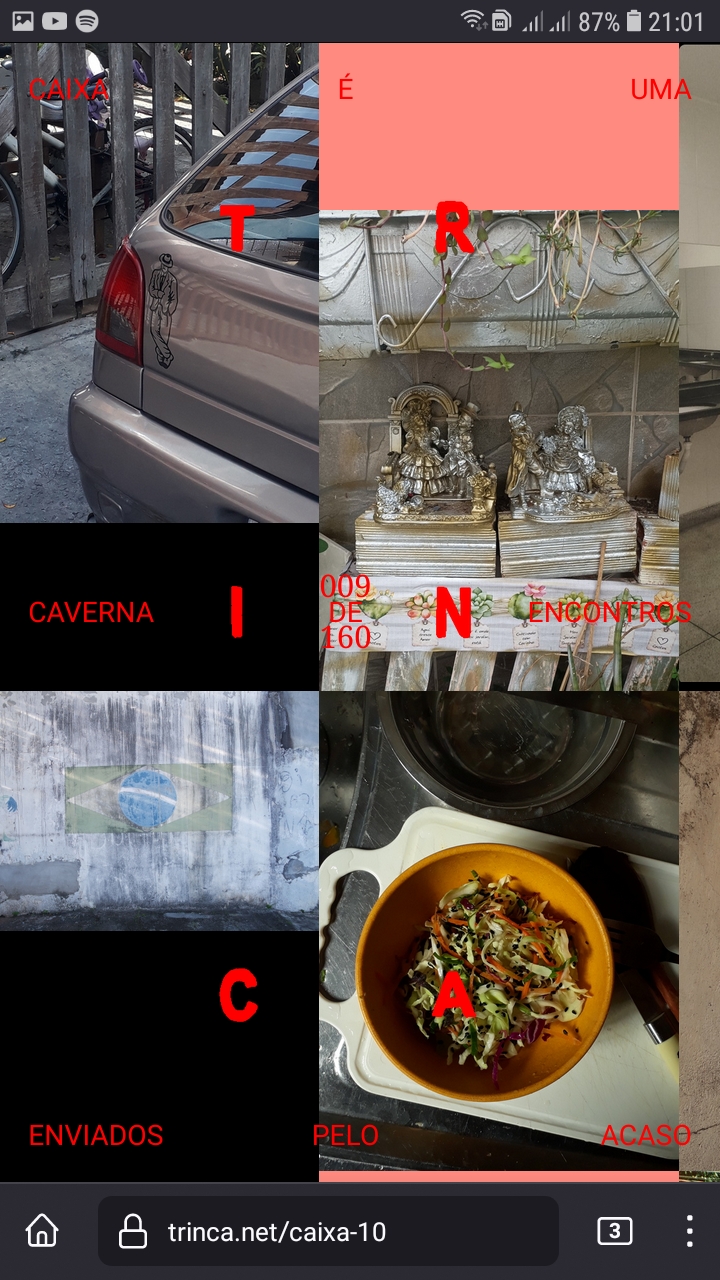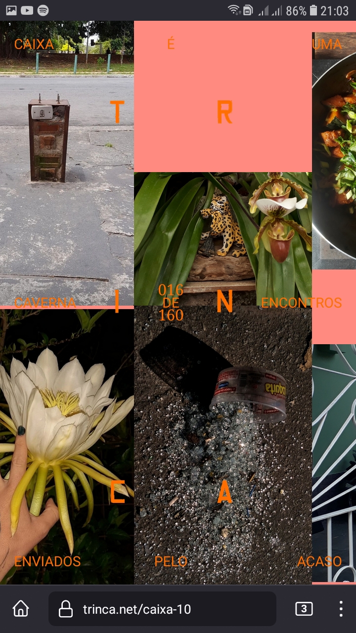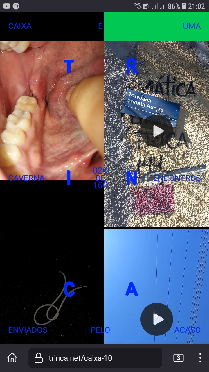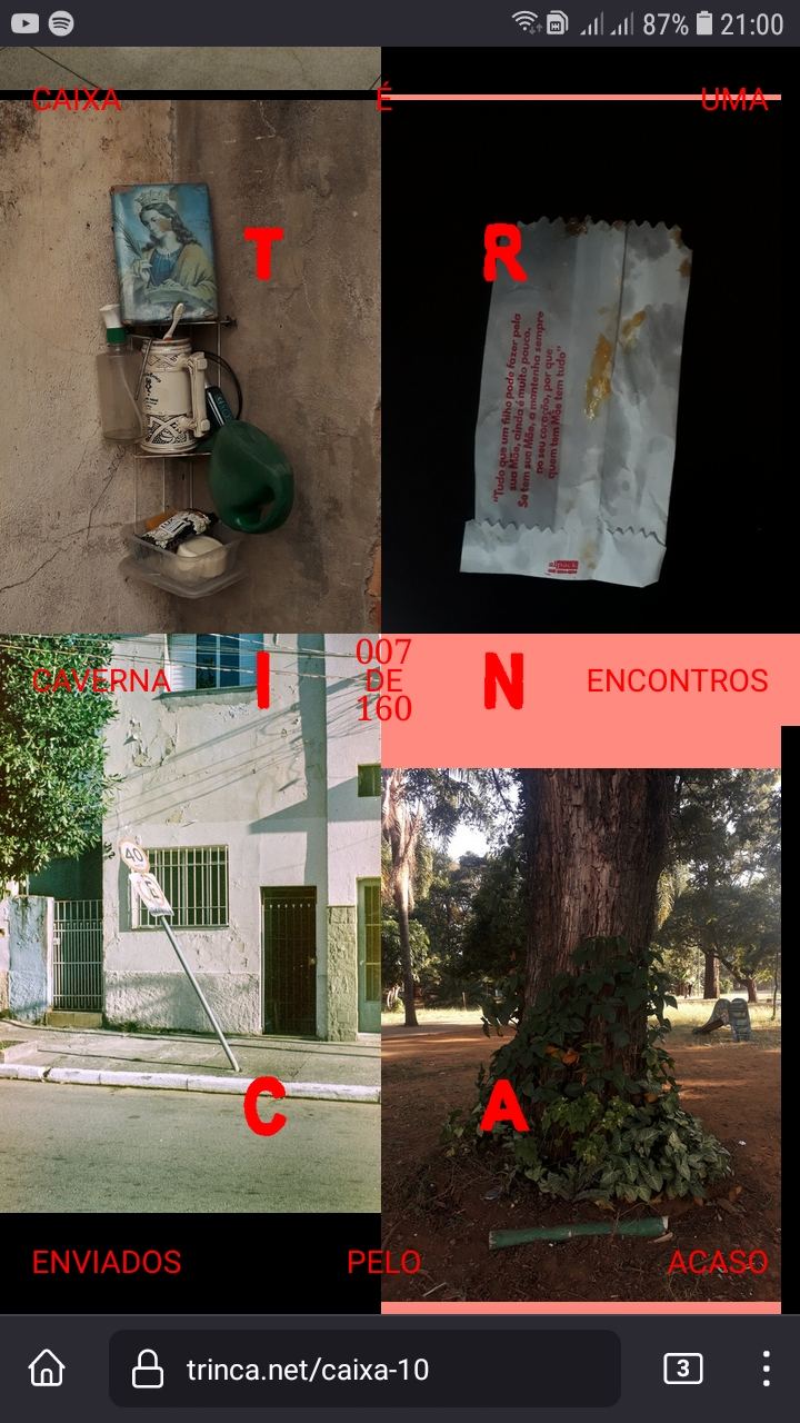 primeiro trabalho nosso como trinca, um código gera um site em 3 camadas: fundo/ mídias/ texto. as imagens carregam pretas e se revelam quando o cursor do navegador passa em cima, como num jogo oracular. a cada visita o código gera uma nova ordem, tamanho e posicionamento das mídias e combinação de cores.